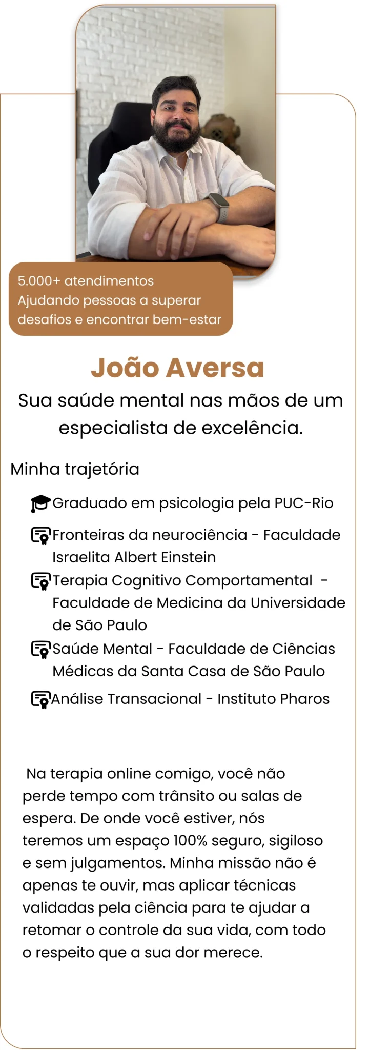 Você não precisa lidar com esse peso sozinho. Terapia online segura e acolhedora com um psicólogo especialista (USP, Einstein e Santa Casa) e mais de 5.000 atendimentos realizados.